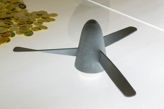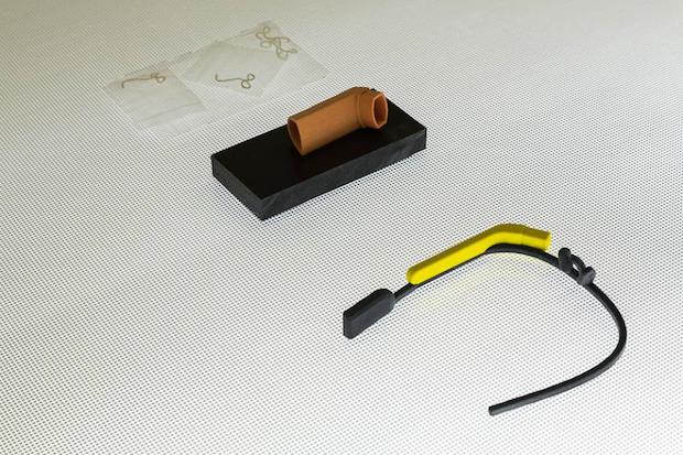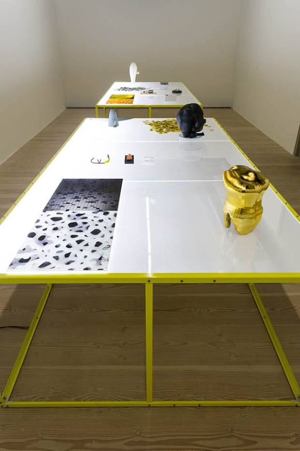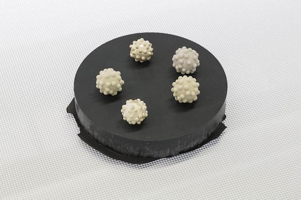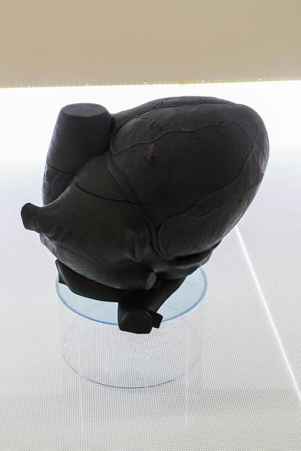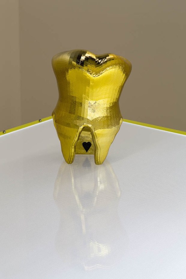The same sort of attention to detail is visible in the presentation of Sawtell’s smaller sculptures in Focal Point’s Gallery 2. Eschewing formal plinths, these works sit on two bespoke tables made from a light box embossed with graph paper-like grids and supported with a powder-coated metal frame in neon yellow. The result is half examination table, half industrial work bench, and sets up the room for communal dissemination. For #STANDARDISER, Sawtell was keen to explore the idea of sculpture driven by data and so combed the internet for freely available, non-copyrighted wireframes which she could download to form the basis of her works. Ranging from the microbes of viruses like Ebola and Hepatitis C, to parts of a military drone, to a life-size model of the human heart, these digital patterns were then used to 3D-print and CNC-machine physical iterations. Intricate and often beautiful, these sculptures also show the variety and democracy of the internet, which allows the individual to self-manufacture something as innocuous as a replica human molar or as threatening as a military aircraft.