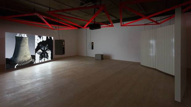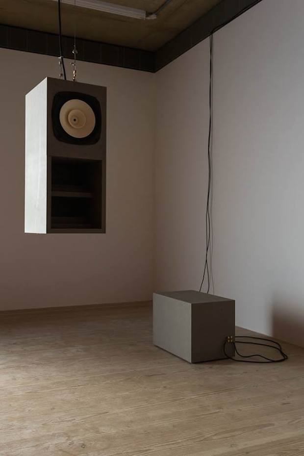 Sawtell, who has previously described her practice as investigating ‘the screen as a lens’, is fond of using dual images to create tension. This CGI animation is similarly unsettling in its movement. Whereas the glossy fluctuations of the oozing snowflake are presented to the reader straight on, in the other half the observer circumvents the cooling tower like a low-flying drone. The contrast between the two vantage points creates a disturbing sense of motion sickness, aided by the dark rumble of the piece’s sonic element. Sawtell, also an electronic musician and sound artist, has designed and installed a custom-made modular acoustic display for the exhibition, which works as an acoustic mirror to focus sound waves emitted from a series of audio transmitters into a central focus point. The result is a unsettling spacial element to the gallery: some areas feel heavier than others, depending on where the sound is concentrate. Sawtell’s engagement with the production of her show, including the craft of its display, is admirable and makes for a holistic installation rather than just an video piece.