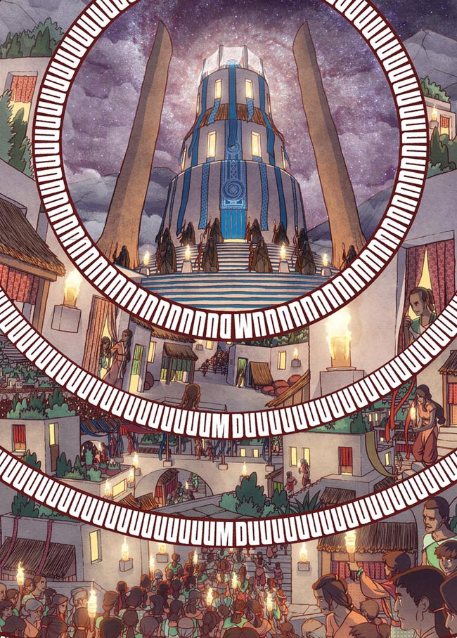 Although there are evident reservations towards new technologies influencing how comics are created and read, the fact that criticality around comics is still in its infancy should not inhibit modes of experimentation that bypass or extend upon our current understanding of the form. 2001 isn’t specifically unique either. In the current British Library exhibition, Comics Unmasked: Art & Anarchy in the UK, a final section that focuses on webcomics features The Firelight Isle by Paul Duffield. This work, which launched in 2011, is set in a mythical civilisation and is again displayed in a scroll-down single-window interface. Though it demonstrates remarkable compositional technique (the narrative unfolds as though illustrated in an ancient scroll), The Firelight Isle still compartmentalises specific actions in panels and dialogue in traditional speech bubbles. It is an example of development of narrative style not matching the ambition of development in composition.