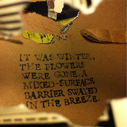 One of Overby’s major works, 2101, is a photographic webcomic that incorporates text and collage. Every photograph has its edge, its frame, but each picture is a messily composed tangle of line, form and printed matter. The story is told sequentially, one photograph following the next, but progress is entirely left-to-right, a horizontal forward movement without discernable end. In this sense, its rejection of structuralism is its formal constraint. Paired with its motion, it calls to mind the famous tracking shot from Jean-Luc Godard’s Week-end. Like the Godard film, 2101 feels portentous, its journey as revealing as its conclusion.