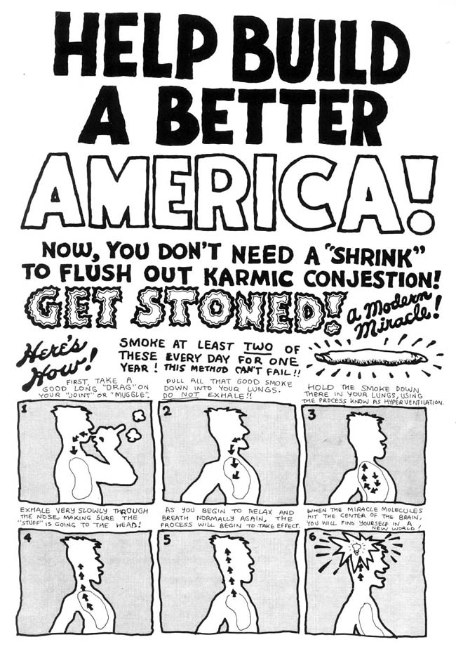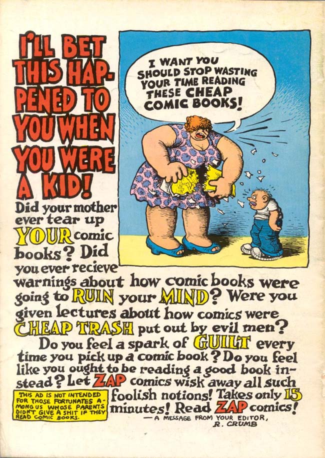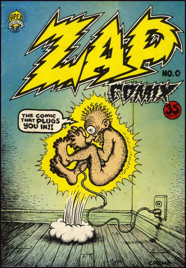 It was not until the late 1960s however, that comics embraced the idea that content could be reappropriated and skewed to invert its original purpose. One publication was particularly fundamental to this turn: ZAP, created in 1968 by a group of eight cartoonists (R.Crumb being the most well known) and published in San Francisco. It was the progenitor of a new sub-genre called comix (alternative, independent press comics). This was graphic storytelling’s avant-garde scene: humorous stories of sex, drugs and comic violence; self-caricatures of the cartoonist undergoing periodic bouts of existential angst; parodies of everyday individuals such as Whiteman, a suited, uptight workaday Joe American, internally seething at an increasingly permissive society; or Mr. Natural, a mystic yogic guru and sybaritic conman.