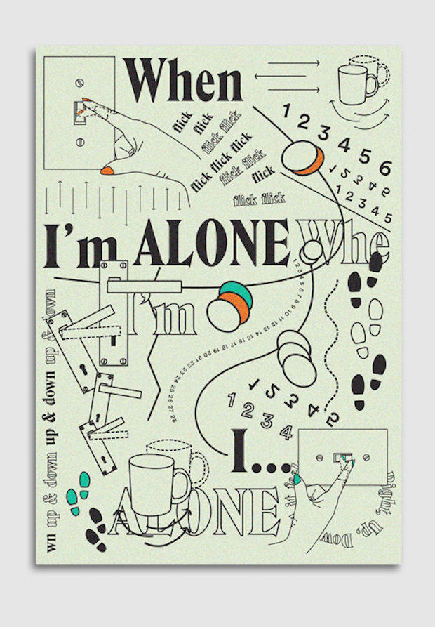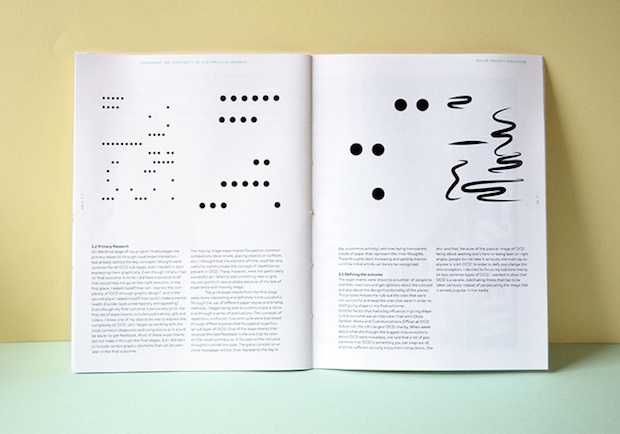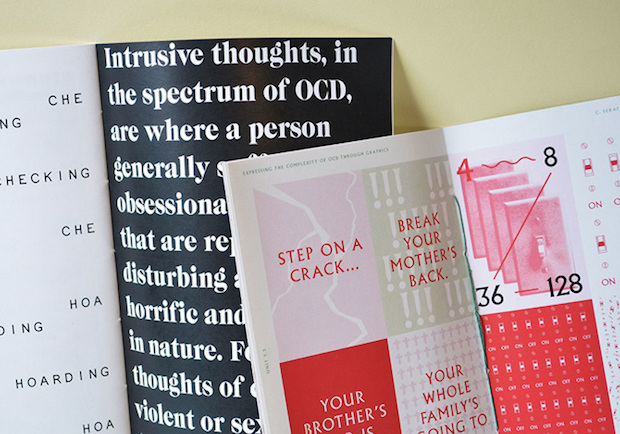 My aim was to see whether it was possible to communicate through graphic design the abstract and complex concepts that characterise OCD. Even though people in the UK today are beginning to speak more about mental health than they have in the past, I still find the approach of certain charities and organisations victimising and a bit tragic. I thought that through my design project I could talk about these issues from somewhere other than theory and facts, and I could add a different perspective to the ongoing conversation.