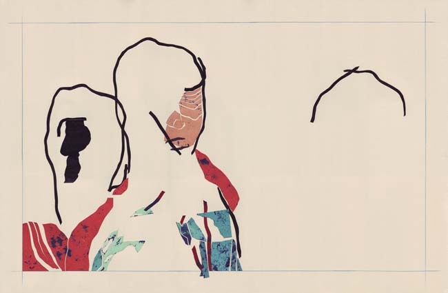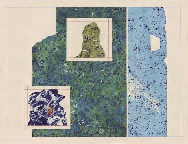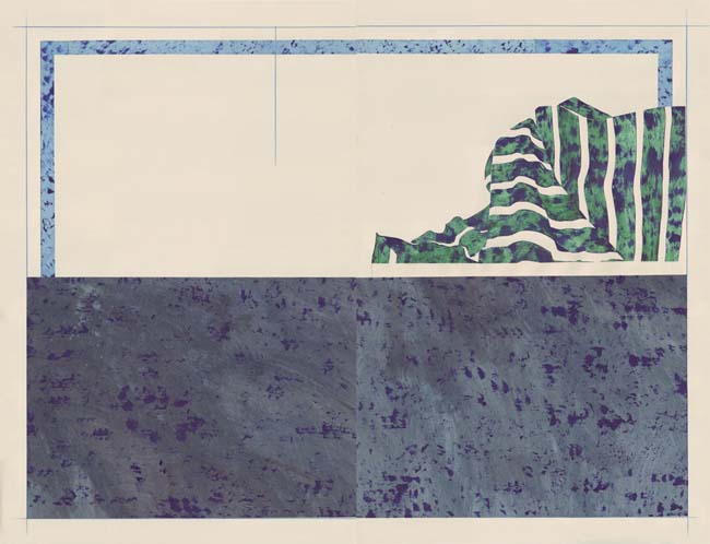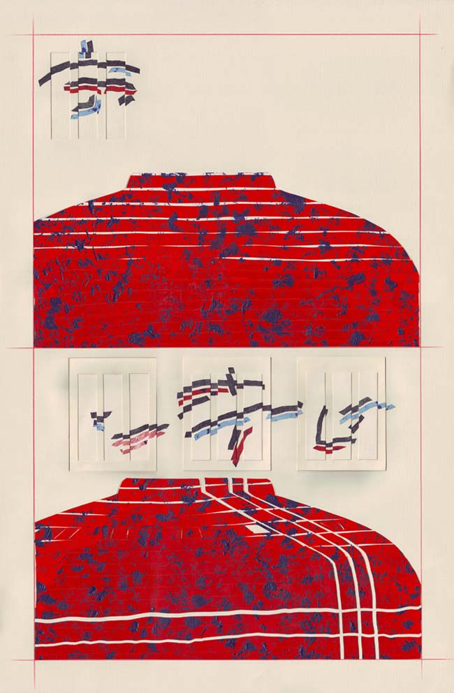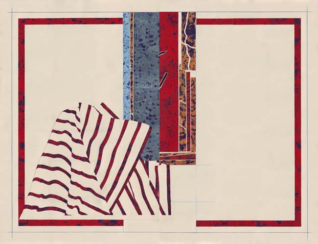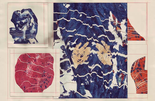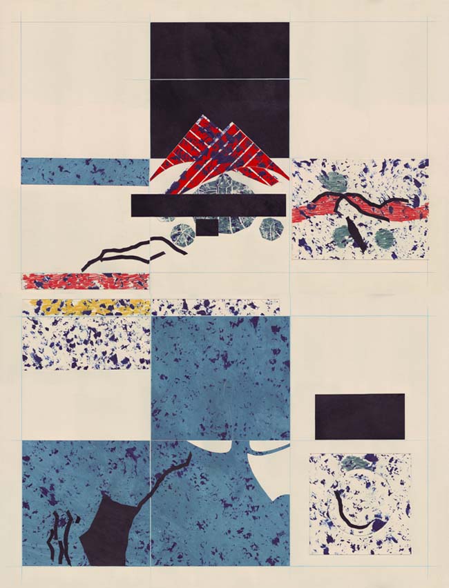 I always paint on paper. I use a heavy 80lb stock. The painting part is completely intuitive, just figuring out the textures and mood. After I reach the desired surface look, I cut the paper with a blade and do the composing onto a larger sheet of paper. I always use an off white paper as white is generally far too bright for someone like me who loves negative space. Also, I want white as a colour to appear as strong and dynamic as the other colours when I use it. The beauty of working on paper is that I can repurpose unsuccessful images. For instance, if a piece doesn't end up the way I want I can cut out the elements or parts of the composition that worked and simply glue it into another composition. Another benefit of working this way as opposed to a traditional painting process is that the compositional process is fluid until I glue it down, meaning that I can try out a number of different compositions.