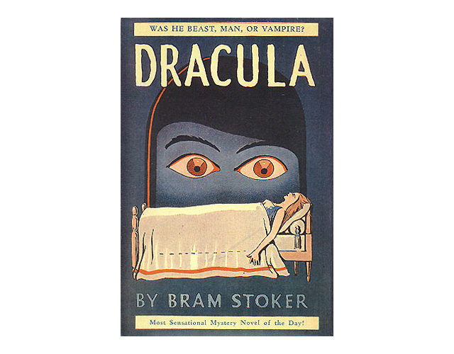 Later editions took more literal approaches, like the 1902 Doubleday cover which depicts a looming, shadowy cloaked figure; or the 1930s Grosset and Dunlap edition which features an enormous pair of eyes hovering over a women lying in bed. Some, like Scholastic Classics' 2002 paperback, which shows Dracula emerging from a coffin surrounded by spiky gothic type and architectural forms, were perhaps too obvious.