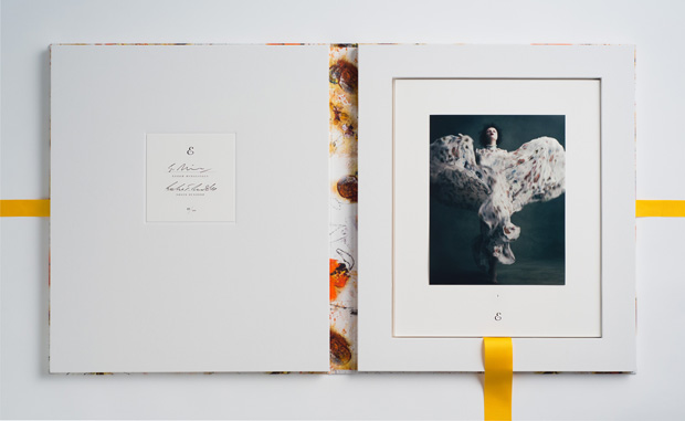 The images are printed on metallic photographic paper and hand tipped onto card embossed with the Erdem 'E' marque. The book that accompanies is hand-stitched and tape-bound, with the X blind-embossed on the cover and foil-blocked on the fly cover. It features written contributions by Anna Wintour, Tim Blanks, Sarah Mower and Alexandra Shulman amongst others.