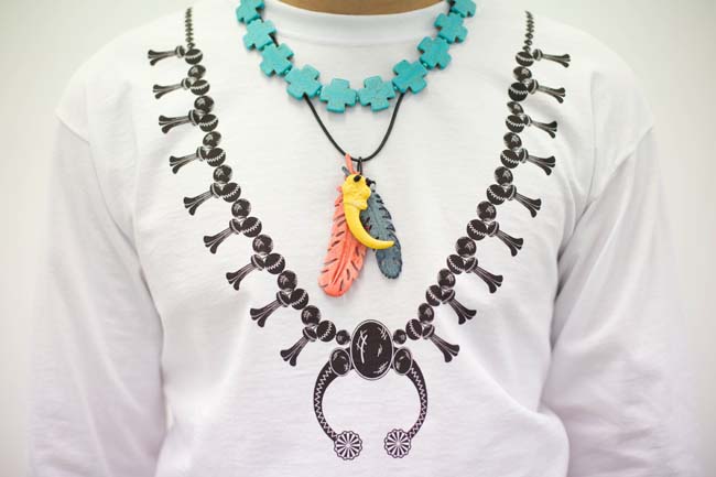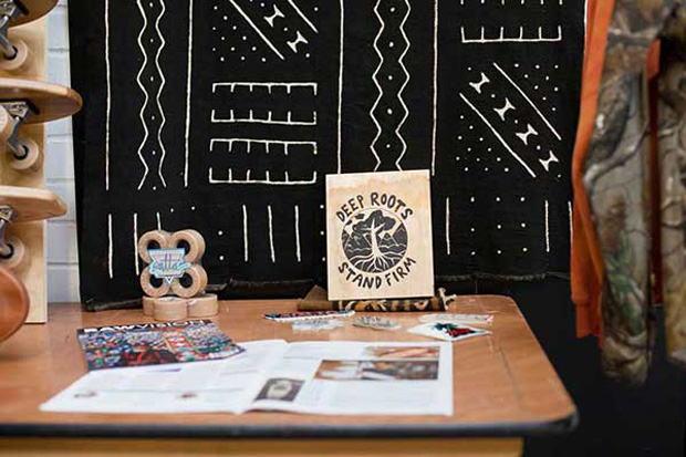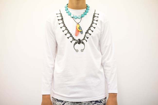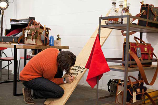 Knight Mills is another up-and-coming brand. Run by Sasha Knight, the brand makes graphic t-shirts and sweats, jewellery and hand crafted leather and canvas bags. The term 'mills' is a nod to brands like Woolrich Woollen Mills and Pendleton Woollen Mills, and points to the founder’s reference points. Hers too is a modern-come-post-modern take on Americana, but in a reduced and often abstracted way that gives the visual references an iconographic and symbolic feel. There's an unapologetic playfulness with the forthcoming Spring/ Summer 2015 collection that combines a sense of indigenous North American nations with trompe l'oeil. Not surprisingly, it was located in the same space as Human Made, TRSPT and my brand, House of Garmsville, which also taps into the notion of American heritage but from an abstracted pointed of view.