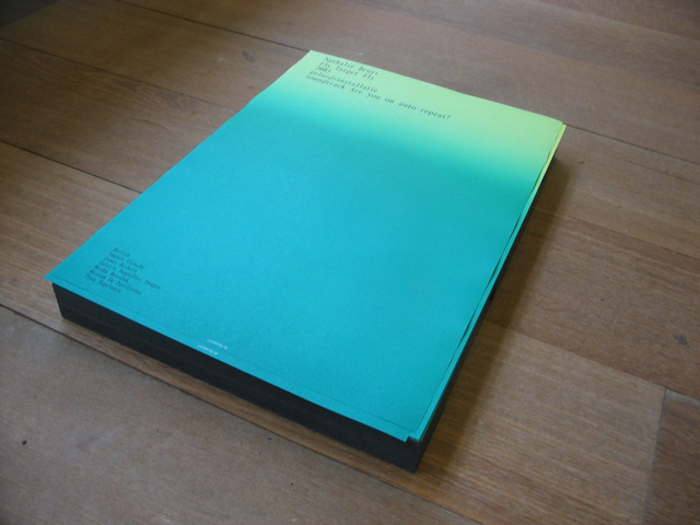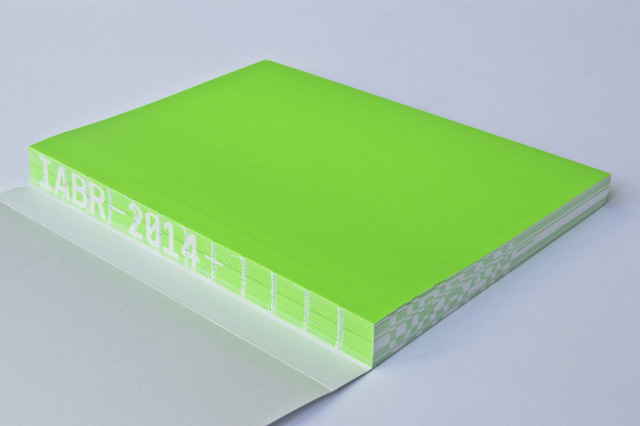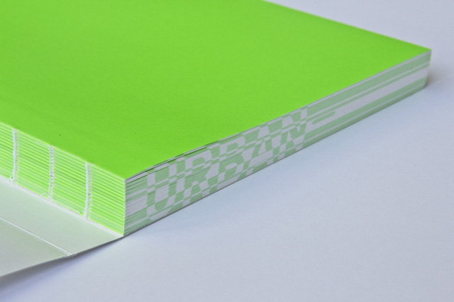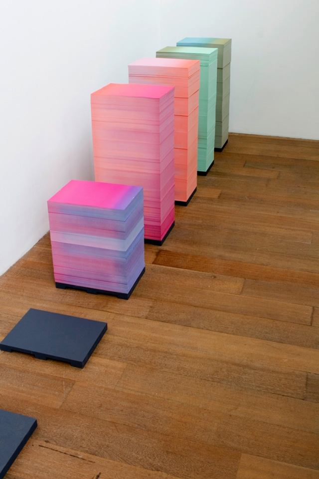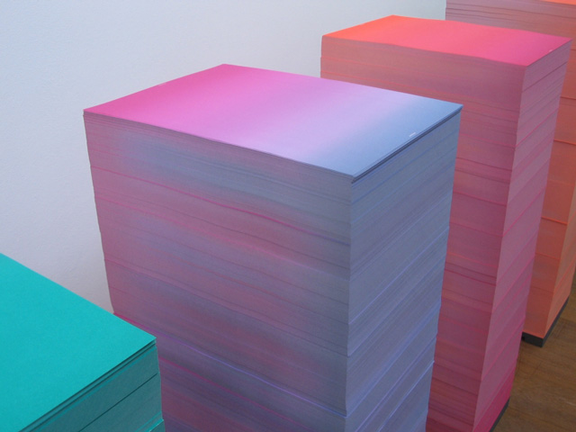 Using a printing process known as ‘split-fountain’ printing, this technique involved printing multiple colours on the same roll during a single print run. Rather like its degree show LUST Bible the project used a large amount of paper stock to reveal process – in all 80,000 A3-sized sheets were exhibited as a paper sculpture, in ten stacks of 8000 sheets, with visitors able to print their own unique copy of the exhibition catalogue.