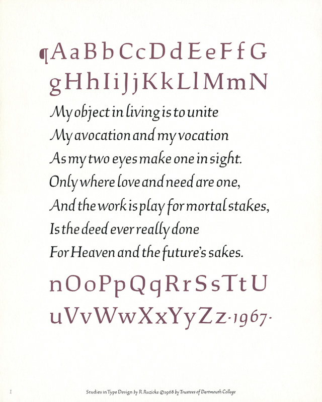 “Type is meant to be read,” Ruzicka wrote in the booklet announcing his first typeface, Fairfield. “To submerge consciousness of type, all obvious cleverness must be ruled out. There should be a kind of impersonal ease about type—type is after all only a medium between writing and reading. But to invite continuous reading, type must have a subtle degree of interest and variety of design.”¹