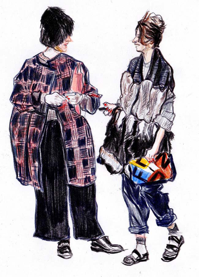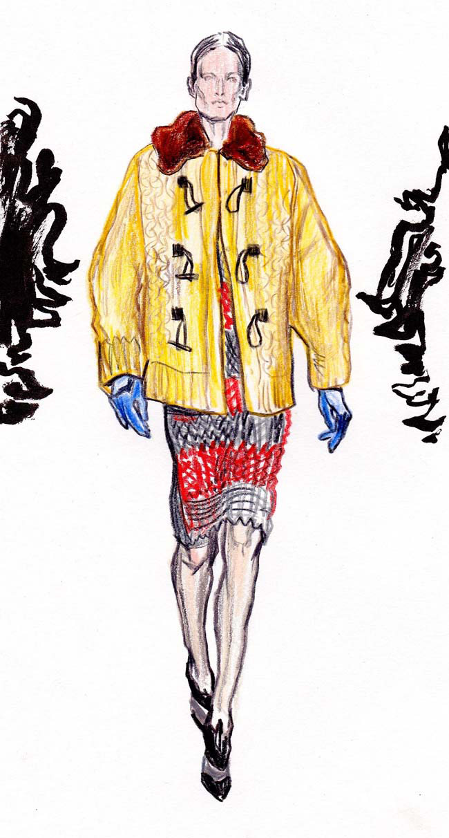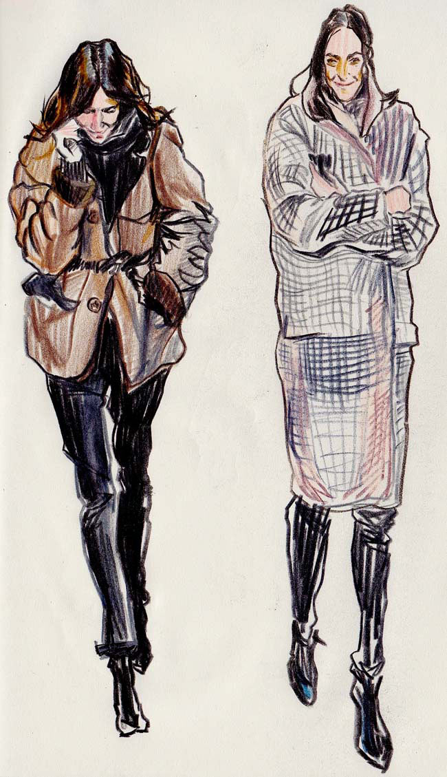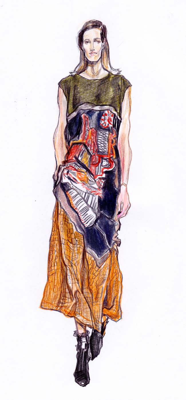 I recently saw the Dries Van Noten retrospective in Paris, which was exquisite. His work is so wonderful to draw and also quite illustrative in its own way: full of narrative. Likewise, with designers such as Nicolas Ghesquiere and Miuccia Prada – they really capture my imagination as their work contains such a wealth of ideas. Jean Philippe Delhomme is a constant inspiration too; I’d like to just visit his studio.