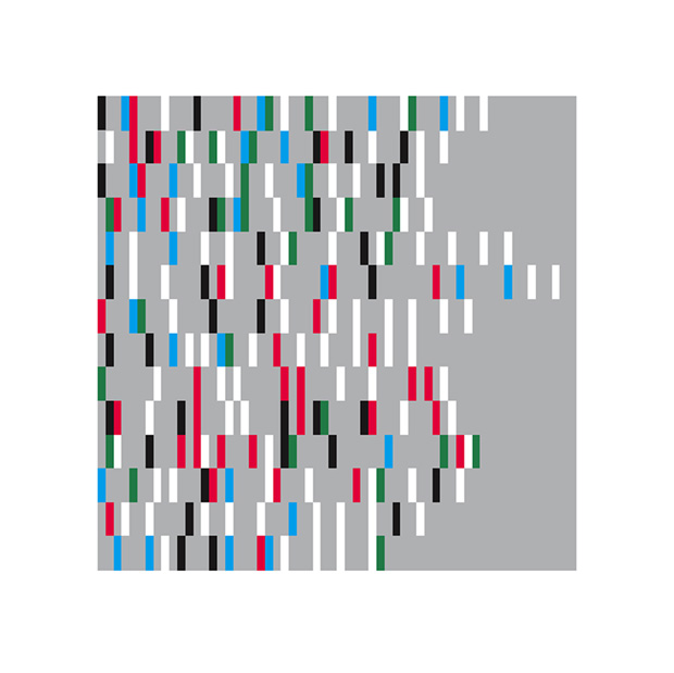 Christian Bök's poem Of Yellow takes Rimbaud's poem Voyelles at its word. In the original poem Rimbaud has attributed a colour to each vowel: A Black, E white, I red, U green, O blue. Rimbaud’s poem was passed around the avant-garde literary scene in Paris of 1871, distributed hand-to-hand, creating rumours that Rimbaud had discovered the synaesthetic mysteries of language As if the poet had gone out on the astral plane with the five vowels, returning with their colour coded logic. Bök's piece takes that possible hidden meaning and updates it through digital, suggesting the hidden structure behind Rimbaud's poem, revealing the colour behind each letter as they appeared on the page in the original poem. This poem was used as the front cover of Christian Bök’s best-selling book Eunoia which creates many other univocalisms (poems that use just one vowel). As a visual piece, these slim bullions of red, blue, green, white and black, are an invitation to see the world as Rimbaud did, through a systematic derangement of the senses.