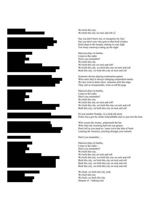 Cecilie Bjørgås Jordheim’s We Built This City doesn't just take the great modernist trope of turning popular culture on its head so much as on its side. The artist took the lyrics to Starship’s 1985 songs blocked each line with black, then turned this new structure 90 degrees to the left to create a skyline: the city structure that the poem is about. As the artist says "In this way We Built This City has built a city". This is one of the pieces in The New Concrete in which the visual poem ends up with very little text in the foreground but has been created through a re-appropriation of a specific piece of text. There is a wonderful tension in the piece between its abstraction and sheer sense of fun which reminds us of James Joyce's internal monologue in Ulysses which captures Leopold Bloom singing hits of the day such as "those lovely seaside girls". This is conceptual language art that brings a smile.