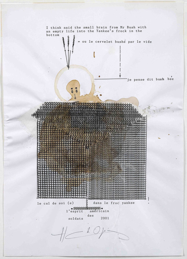 We chose one of Henri Chopin’s dactylopoemes from a series of five works all titled Bush and dated August 2001. The work feels prescient: created in the weeks before the September 11th, and three months before George Bush launched Operation Enduring Freedom in Afghanistan - the coffee stains are like dried blood and hint at the conflict that was to come. His work is both funny and furious, and you get a sense of this fury in the way that he’s pounded the keys on the typewriter to get the depth and layering of the patterns around the coffee stains.
