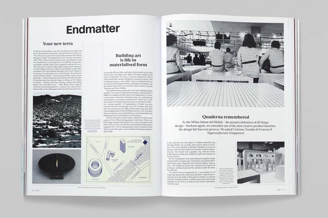There was no written brief, though at the beginning of the design process there was of course plenty of discussion. Laura and the design team (Robbie Mahoney, Fabio Schmieder and myself) would bring along examples of past publications that had some kind of relevance to what we wanted to achieve. It transpired that we had a lot of the same stuff on our individual bookshelves. Talking about these publications was a good way to hone down the visual language of MDR. After these conversations we made a series of mock-ups using place-holder content to define the magazine's architecture and typography. We commissioned Housestyle (Richard Dawson and Dave Farey) to create the magazine’s headline serif and sans-serif fonts. When the real content for Issue 1 started to arrive in December 2013 we were pleasantly surprised to find that the hypothetical structures basically worked and little further adjustment was necessary.