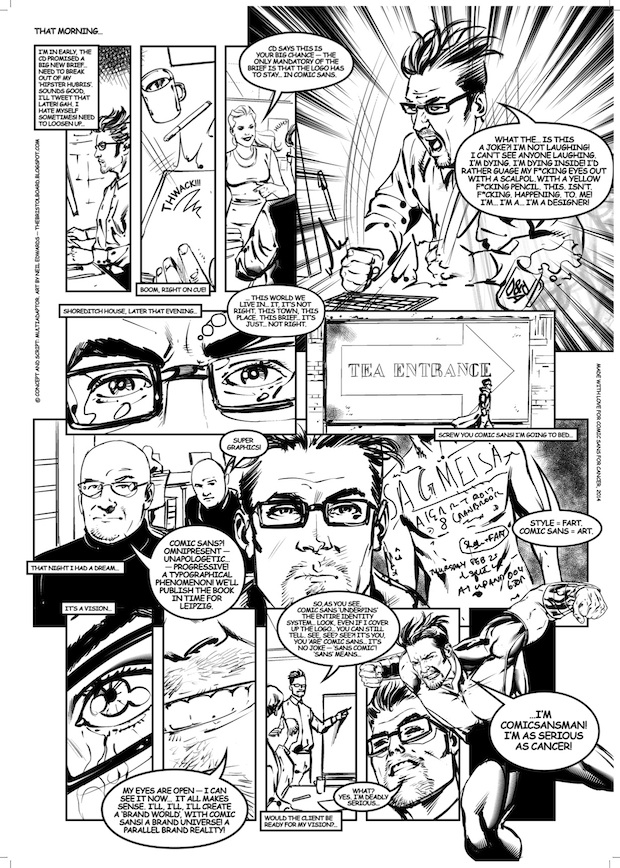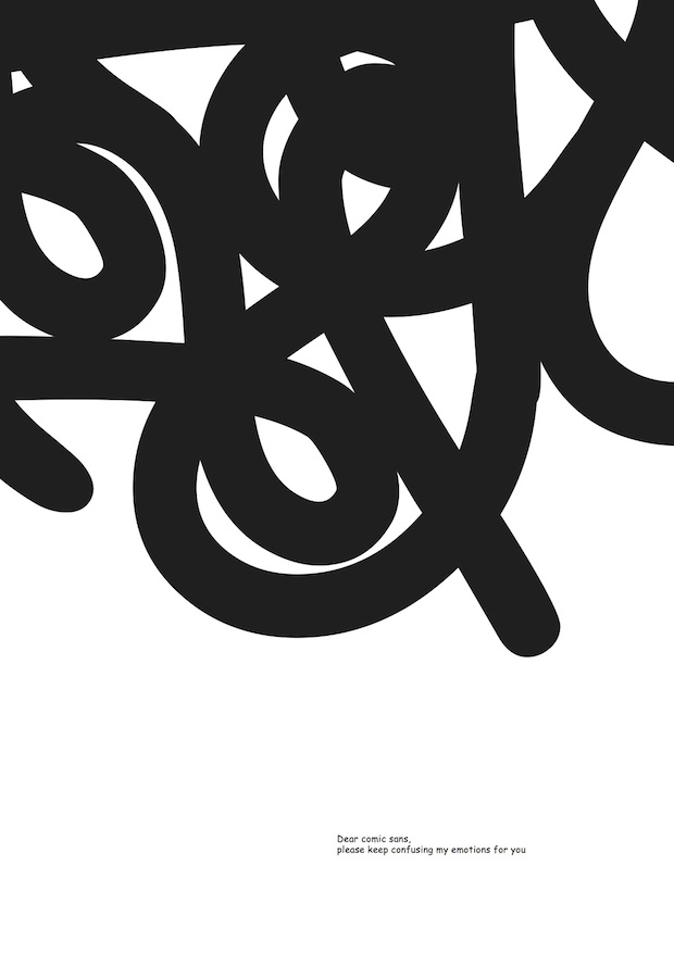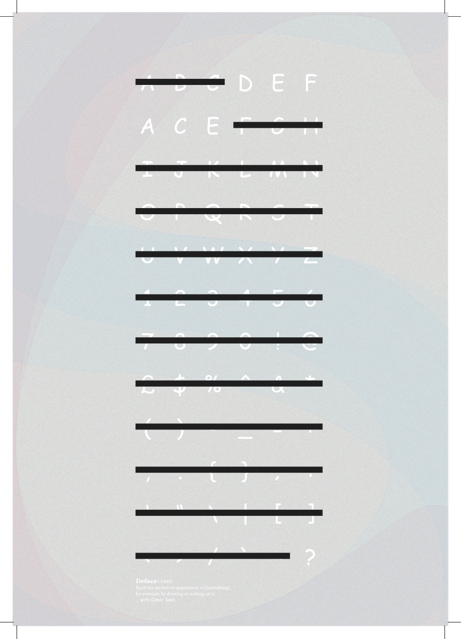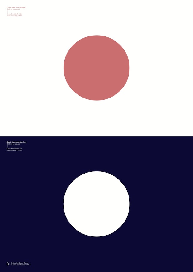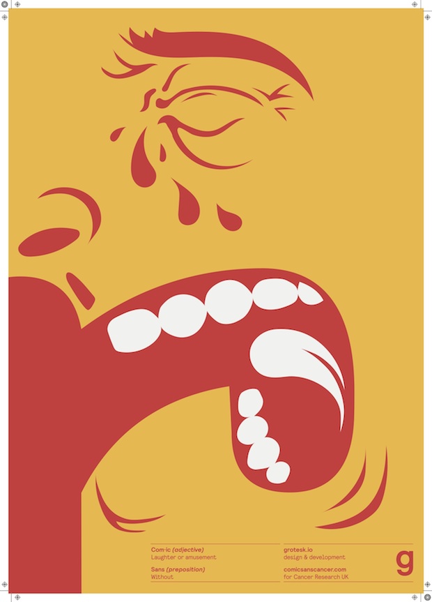 It’s this love/hate relationship with the much-maligned typeface that new exhibition Comic Sans for Cancer plays on. To celebrate twenty years since it was first in use and to raise money for Cancer Research UK, exhibition organisers Chris Flack, Renee Quigley and Jenny Theolin tasked two-hundred designers (including Connare) to create a poster that addressed how they felt about Comic Sans, or how the world would be without it. The results, including the ten posters shown exclusively here, will be shown at London venue The Proud Archivist from 20 August.Comic Sans for Cancer