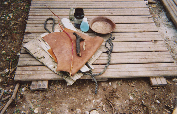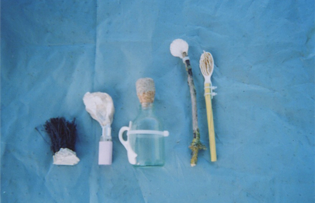 We looked at the entire island as a residence, following the natural suggestions for several room-like spaces. We carefully collected natural and artificial finds, relics and trash, that we put together to create furnishings and furniture. We put contrasting pieces together and displaced others to tell our story. In our land we arranged a rough kitchen, living room, bedroom, meditation beach, alchemist’s laboratory and a wunderkammer or cabinet of curiosities (above).