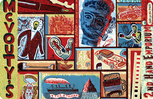 In the latest of its series of illustration-led exhibitions (previous subjects have included Rob Ryan and Mark Hearld) the Yorkshire Sculpture Park plays host to Jonny Hannah's tribute to the High Streets of the past. Hannah has designed a series of three pop-up shops (which include a record shop and a junk shop) which he has created entirely from his own two- and three- dimensional pieces.