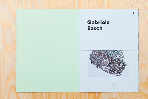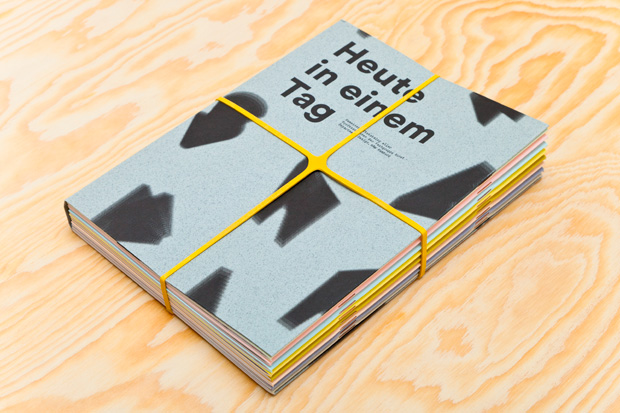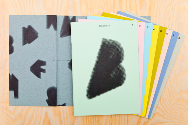 The art catalogue Fachgruppe K contains the works of all eight art professors at the University of Applied Sciences, HAW Hamburg. In June 2013 they had their first joint exhibition with the theme Heute in Einem Tag (or Today in One Day). Together with Lynn Dohrmann I created the catalogue that accompanied this exhibition. We developed a visual concept, which allowed us to present all artists, their work, and their style, in one catalogue, without forcing them together in a single book. For us using one, representative piece for all was not the right solution, so we finally got to the current concept, which is based on the initial letter of the last name of each artist. In reference to the name of the exhibition, we imagined light shining on them like on a sundial. If you place the booklets in a circle, you can imagine the wandering of the light projected on the covers. Another thing we wanted to use was different paper colours to separate the booklets from each other visually. The project is highlighted with copper-coloured staples, a foldable poster including an accompanying text, and varying colours of rubber bands.