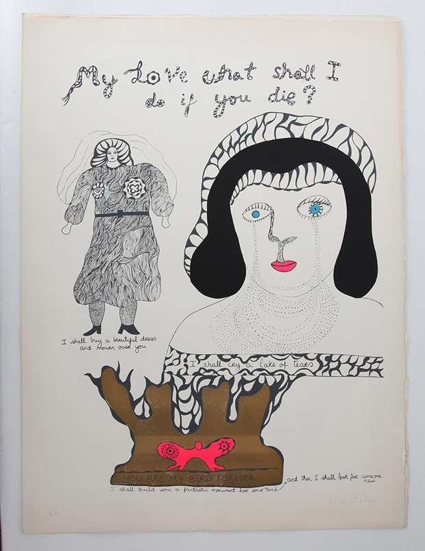 Niki de St Phalle was born 29 October 1930 and died 21 May 2002. She was a French sculptor, painter, and filmmaker. She was married twice, first to the American poet Harry Matthews with whom she had two children and secondly to the Swiss sculptor Jean Tinguely. Saint Phalle and Tinguely lived and worked together until Jean passed away in 1991.