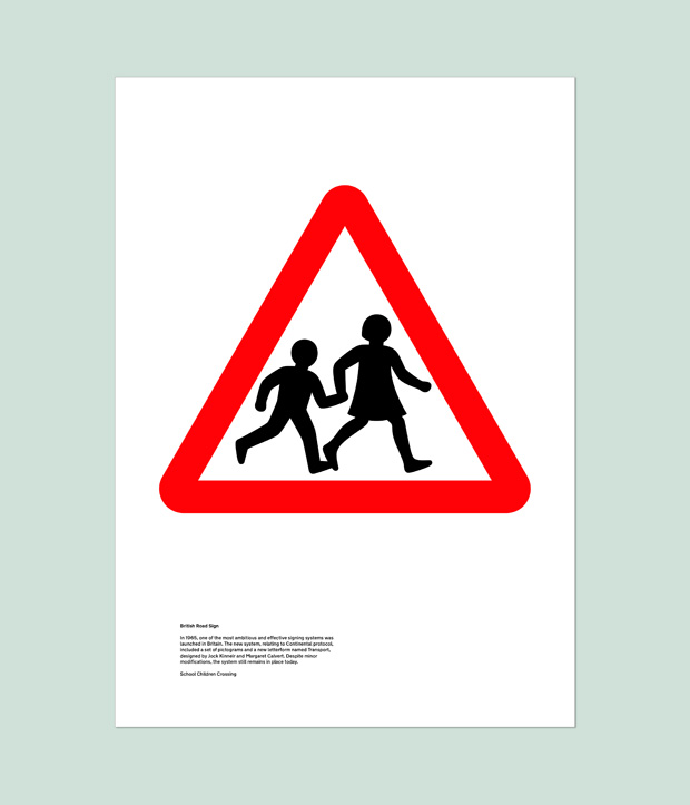 At Pick Me Up, Made North is showing a range of its projects, including beautiful limited edition A0 prints by Margaret Calvert, reproducing five of the most recognisable road signs she designed. Each design has been carefully refined by Calvert especially for this incarnation. This is typical of Calvert’s unstinting, career-long devotion to rigour in design, and an intelligent, humanist approach. When she designed the initial road sign symbols, the drawing of the cow in the ‘cattle’ warning sign was based on Patience, a cow on her relatives’ Warwickshire farm. And, eager to make the ‘school children crossing’ sign more accessible, she replaced the image of a boy in a school cap leading a little girl, with one of a girl (modelled on a photograph of herself as a child) leading a younger boy.