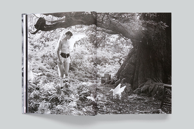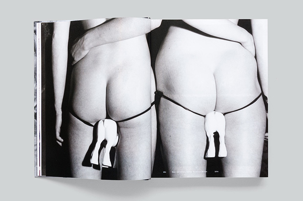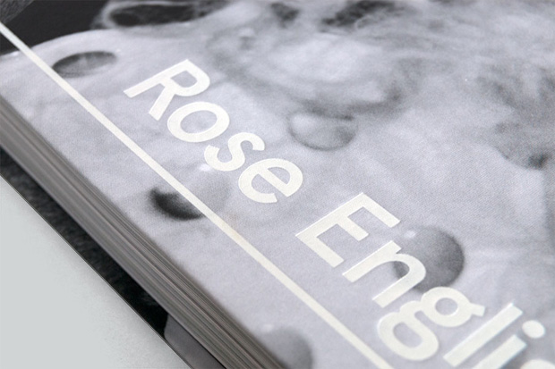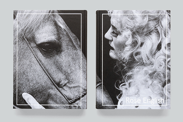 The photographic content also influenced the production of the book: I suggested working with a round spine so that the book would lie completely flat and the full-bleed images would work to their full effect. We also chose for a thin board for the cover (1.5mm instead of the usual 3mm) to keep the book light and flexible, and to create a sense of intimacy. We tried lots of different images for the cover, going over the front, spine and back as wrap-arounds. There were many good options among these proposals, all highlighting a particular aspect of Rose’s career, for instance her early feminist work in the 1970s or large-scale spectaculars from the 1980s. In the end, we felt that this photograph – My Mathematics [performance to camera] (1992) – by Gavin Evans would be the most striking. Horses in general are a fundamental aspect of her work (present from the very beginning) – to show Goldy as her counterpart on the cover worked really well.