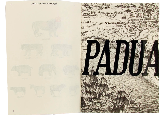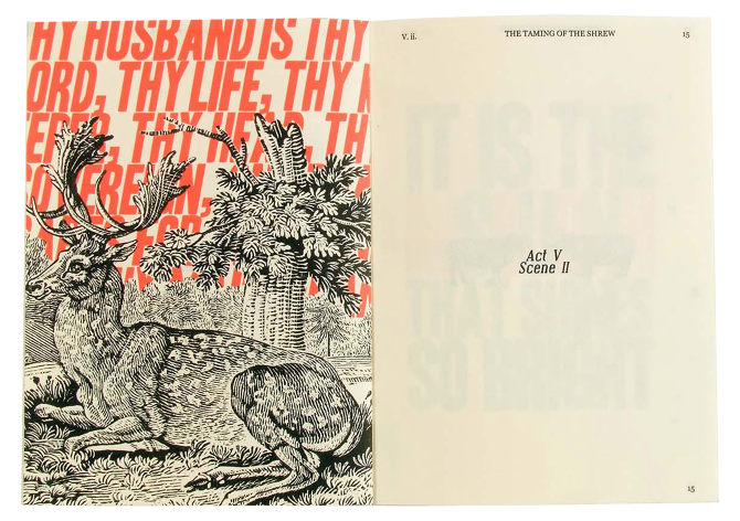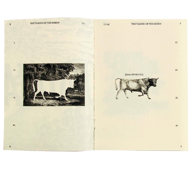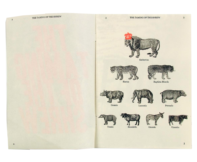 This is a catalogue and program for a children’s version of this Shakespeare play. I like to start researching for projects by physically interacting with the subject I’m working with, so I went to bookstores to look at printed plays. I noticed the specific typography elements and format of plays, such as line numbers on the edges, or character actions, like [Enter] and [Exit]. I photocopied pages from the plays and got rid of all the text except for these specific elements, and this is what makes the main layout of the pages. The catalogue is formatted like the plays, by first establishing the characters, then the setting, then the actions, and then each act and scene. I also found old woodcut illustrations of animals and these are symbols of each character from the play, to help remember who is who.