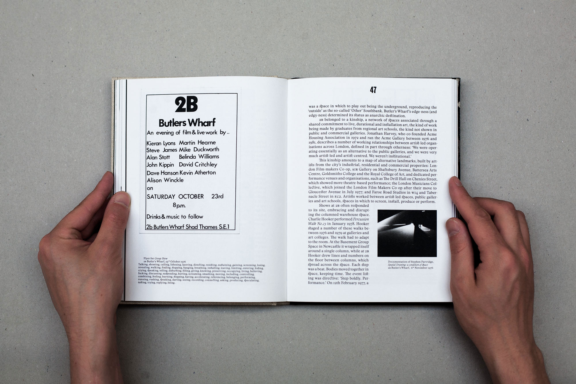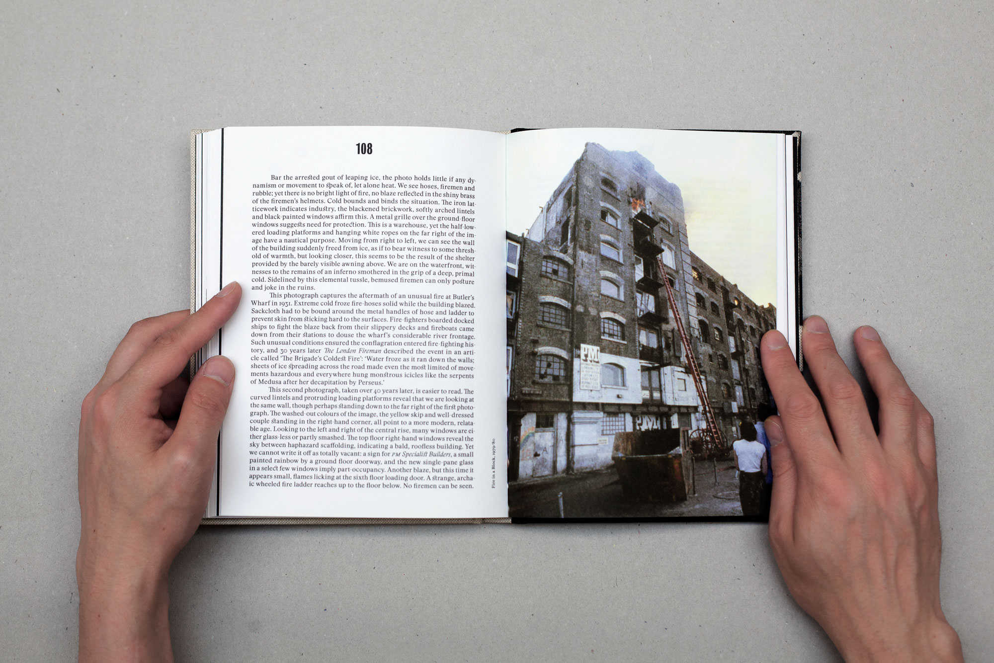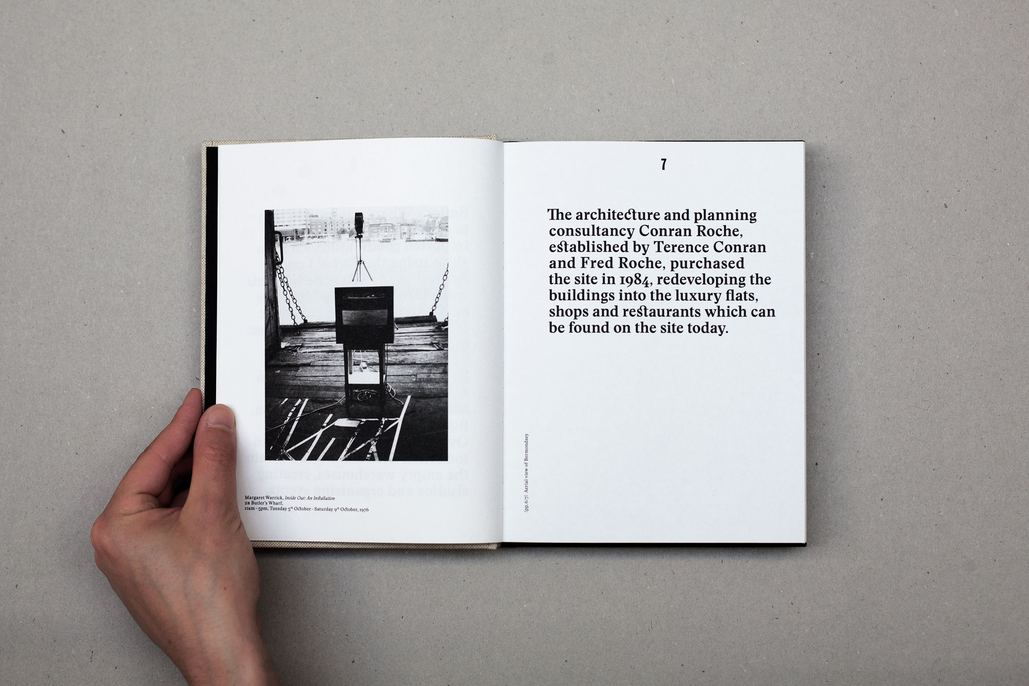 "We had to discover the range of possibilities without losing the wholeness of the book.” This richness also extends to the book’s design. The group decided to work with fellow students from the college’s communications department. For first-year designers Antonio Bertossi and Jörg Schwertfeger this was their second collaboration, and they were keen to be involved from the very earliest stages in order to understand and respond to the content. “It was clear from the beginning that there were going to be different types of texts, and that there was a desire to have these texts treated differently. We had to discover the range of possibilities without losing the wholeness of the book.” One of the most compelling aspects of the pair’s treatment is the use of typography. Serendipitously, both decided independently of the other that Ludovic Balland’s Stanley, a recent derivative of Times New Roman, was the correct and only font for the publication. While its sharp serifs have been designed to provide excellent contrast and so a high degree of clarity at smaller scales, the designers have also used it to create over-sized titles for each essay. It’s a conceit that works closely with the book’s subject, playing on the wharf’s industrial past – “when you enlarge [Stanley], it reveals all those strange little details that give it that legibility, you see that proof of quality and craftsmanship in font making”.