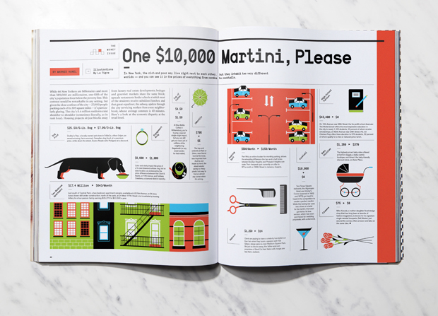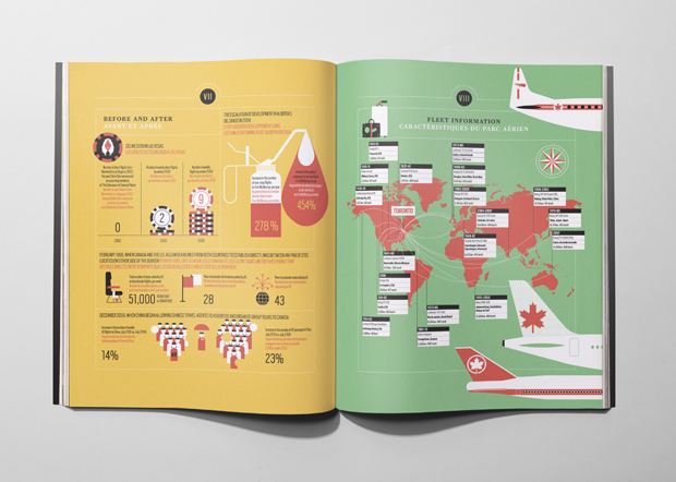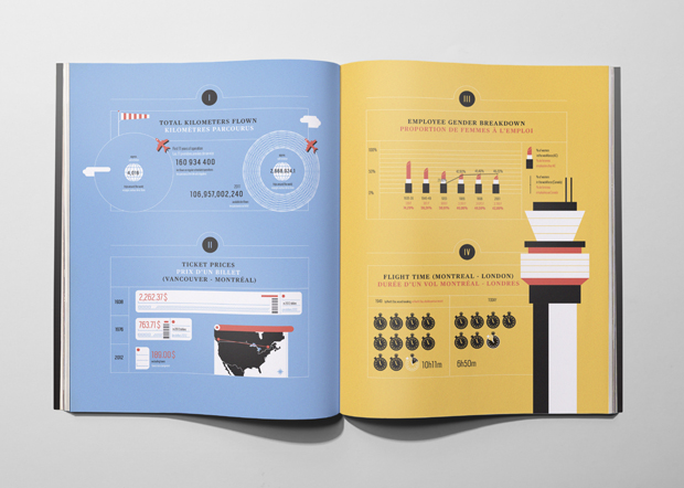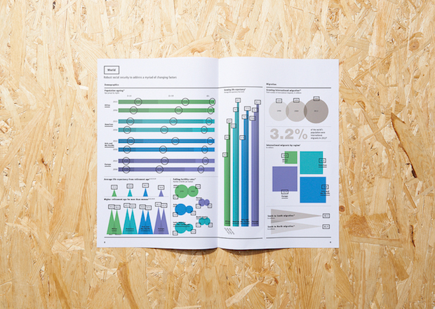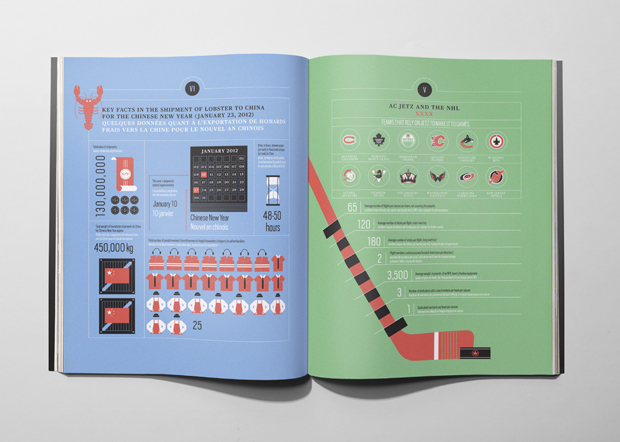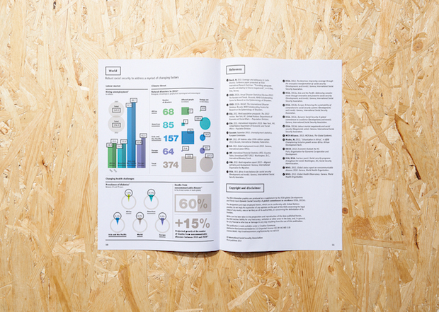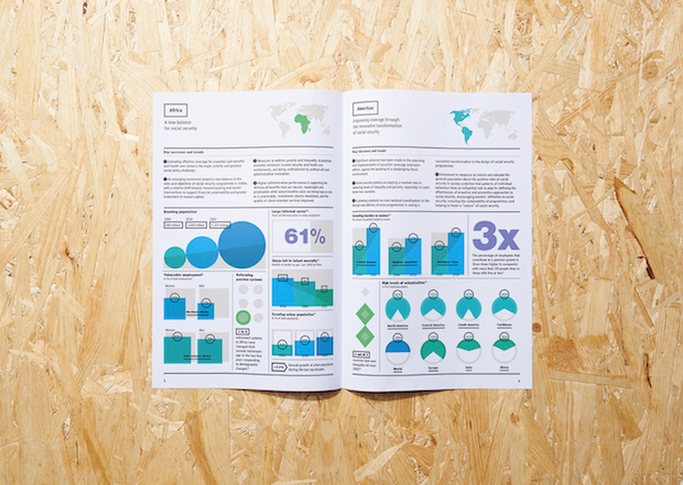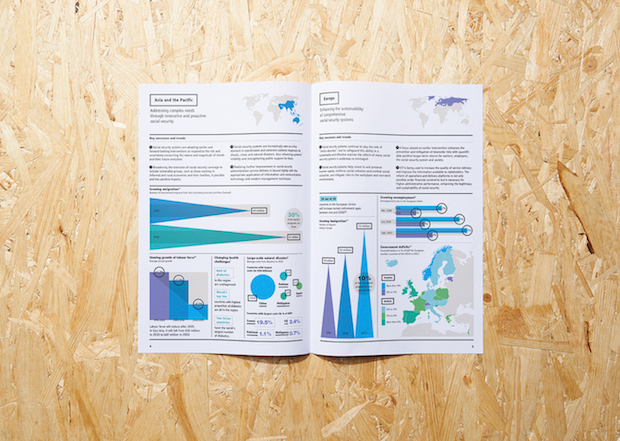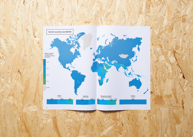 This kind of clarity has also won them projects with clients wanting to present complex data in a more palatable way. In 2012 the duo designed a special infographic report for Air Canada’s 75th anniversary, elegantly explaining the company in numbers, and last year they were commissioned by the International Social Security Association (a Switzerland-based organisation working to improve welfare across the world) to create their global report for 2013 that dealt with statistics-led developments and trends. Unusually for La Tigre’s projects, the ISSA report didn’t involve much illustration, and instead used colour and typography to breath life into charts, graphs and maps. “ISSA talks about life and death,” explains Molteni. “You have to have a fresh approach because you need to fascinate the people reading it but you can’t just play with these topics, you have to give them respect.”